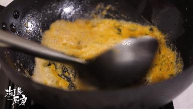 放进 0.5 盐和茶匙(3g) 1 葱花调汤(15g),将咸蛋黄炒至起泡时,放入排放。条。