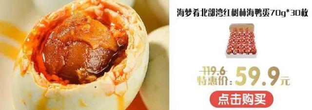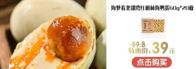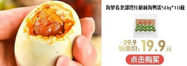 看见这儿绝对赚了!今日限时特价——红树林海鸭蛋蛋营养丰富,味道浓郁。 10 枚只需 19.9!如今 1 枚不到 2 元,某宝同品牌海鸭蛋每一个都要再次流血。 4 元!