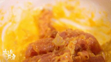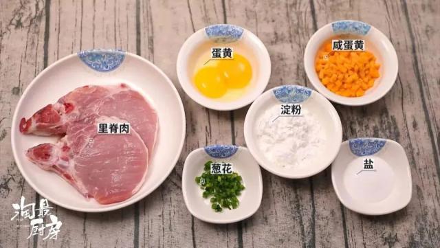 / 食材 / : 2 片里脊肉、2 个蛋黄、125g 咸蛋黄