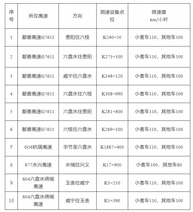 根据贵州省交通运输厅、省公安厅《关于开展全省高速公路限速优化调整的通知》(黔交交通运输厅)〔2024〕3 号码)工作标准,六盘水市境内 G7611 都香高速已经完成了速度优化升级工作。为了规范六盘水市高速公路的交通秩序,有效预防和减少道路交通事故的发生,六盘水市公安交通管理局决定 G7611 都香高速公路的测速设备和限速值同步优化升级,现向社会公告如下: