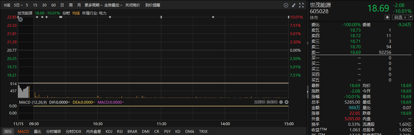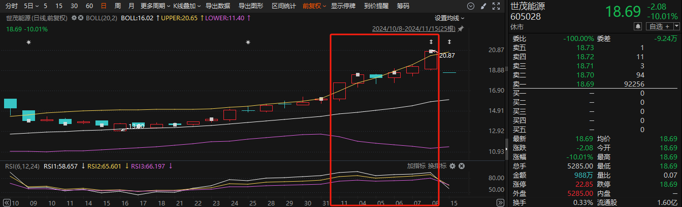 公司于11月14日宣布世茂能源原计划以发行股份和支付现金的方式进行筹备,向上海东福元企业发展中心(有限合伙)和上海旭寅詹鼎企业发展中心(有限合伙)购买其持有的南通詹鼎材料科技有限公司不少于58.07%的股权资产。然而,交易双方最终没有就具体方案和交易条件达成实质性协议。,因此决定停止本次发行股票购买资产事项?。公告次日,世茂能源复牌一字跌停。。