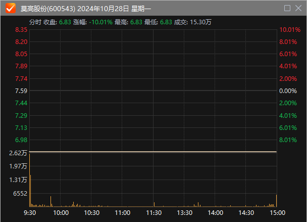 十月二十五日,莫高股份公告,原本计划通过支付现金和增资相结合的方式购买皓天科技51%的股份,但是考虑到这笔交易事项自筹备以来在准备之初,市场环境发生了很大的变化。,交易方核心事项,如支付方式、交易对价、业绩承诺等。未能达成一致意见。经过对交易对方的充分仔细研究和友好协商,交易双方同意并共同同意。决定终止本次交易事项的终止。公告次日,莫高股份一字跌停。