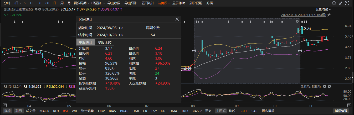 回到八月五日晚上,凯瑞德发布了重组计划公告,本公司股价当日涨停,8月5日至8月8日取得4连板,8月5日至10月28日累计涨幅达到96%。。