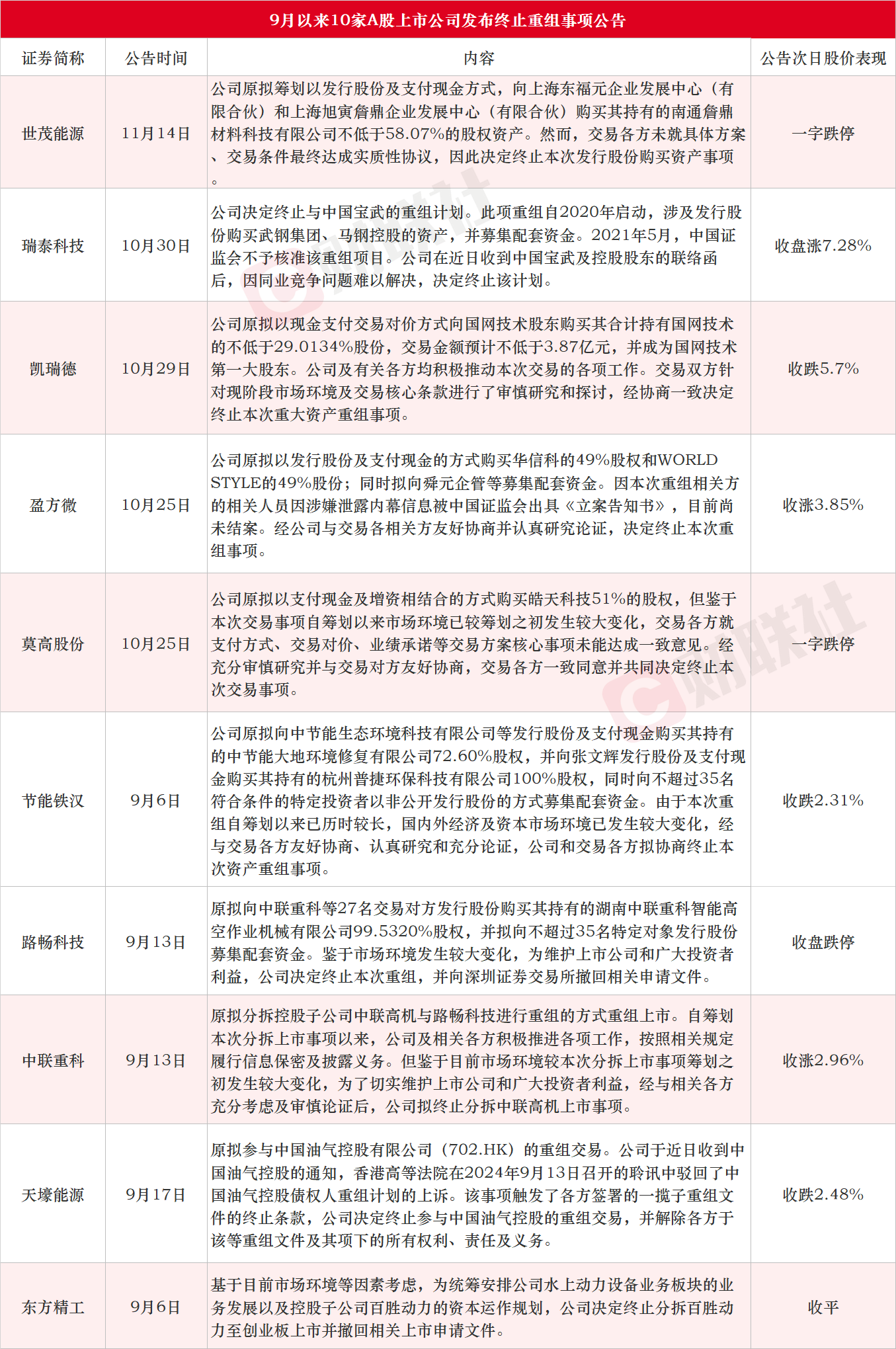根据财联社不完全统计,截至发稿,9月至今包括10家a股上市公司,包括世茂能源、瑞泰科技、凯瑞德、盈方微、莫高、节能铁汉、路畅科技、中联重科、天壕能源、东方精工,公告终止重组。,如下图所示:
