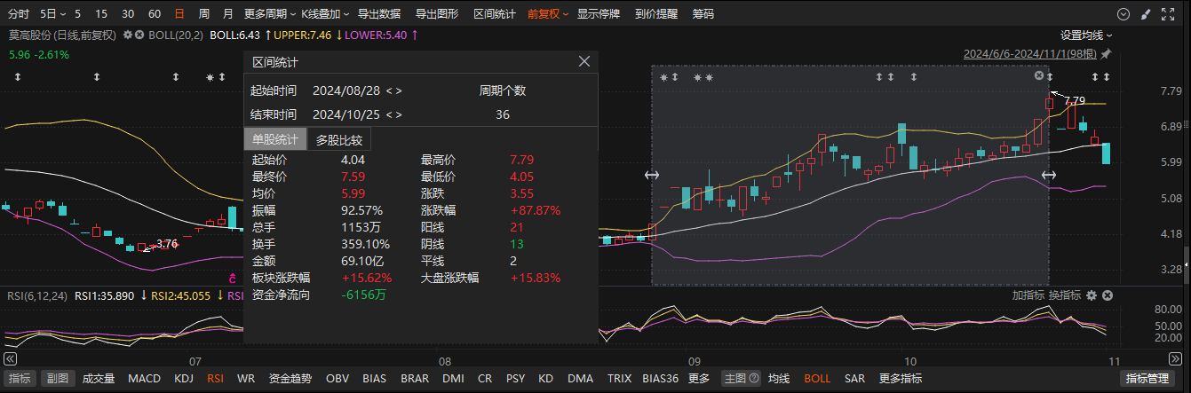 长时间看,8月28日晚,莫高股份披露重组计划公告,8月28日至9月3日,公司股价达到5天4板,8月28日至10月25日,累计股价上涨92%。。