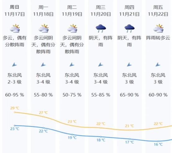 十一月十七日,阴天,偶有分散阵雨;气温23℃-29℃;东北风2-3级;相对湿度为60%-95%。