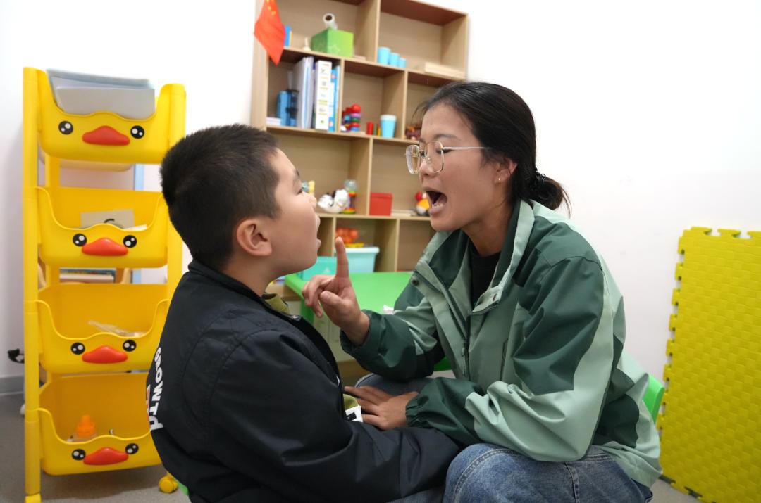 在语言障碍课上,孩子们一句一句地专注于学习发音。贺润/摄影