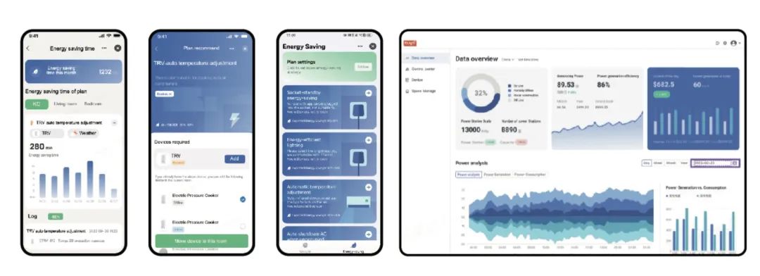 例如涂鸦构建的家庭能源管理系统,可根据即时电费、储电情况和用户习惯,通过 App 设置能耗限额,帮助用户降低电费;对于零碳平台,可以实现仓库暖通、照明等设备数据的实时查看和分析,自动匹配运营策略,实现科学高效的节能降耗。
