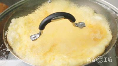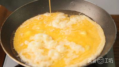 5. 迅速倒入蛋液,不时旋转一下锅面,使其加热均匀。