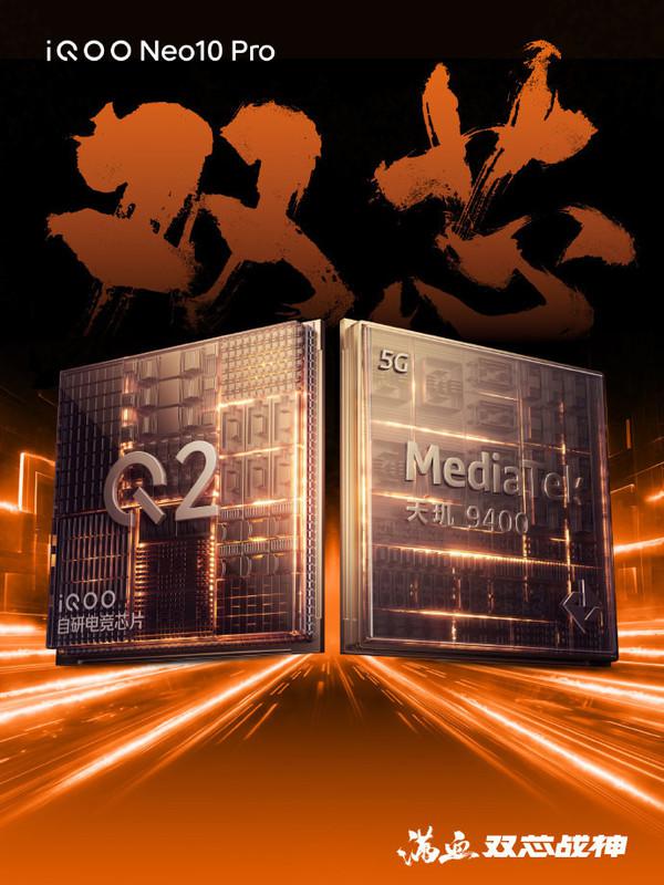 贾净东在文章中透露,iQOO Neo10 Pro 将配备联发科天玑 9400 处理器和自研电竞芯片 形成双芯组合的Q2。其中天玑 9400 被称为“天玑性能之王”, Q2 电子竞技芯片是“超分超帧之王”。这两种组合在游戏性能方面都会有很大的抢占性能。另外,蓝厂还与联发科、ARM 建立联合实验室,进行三方联合校准,实现软硬一体化和双芯合作。