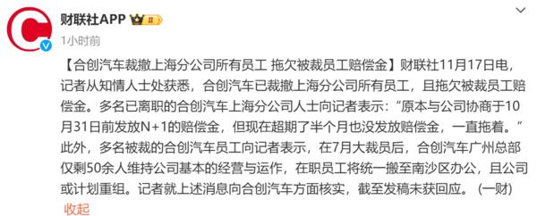 据媒体报道,合创汽车已经裁掉了上海分公司的所有员工,并拖欠了被裁员的赔偿金。上海分公司多位已离职的合创汽车分公司人士告诉记者:“本来和公司商量过。 10 月 31 日前发放 N 1 赔偿,但是现在逾期半个月也没有支付赔偿,一直拖着。”另外,多名被裁的合创汽车员工告诉记者, 7 月裁员之后,合创汽车广州总部只剩下一个 50 保持公司基本经营运作的剩余人员,在职人员将统一搬到南沙区工作,并对公司或计划进行重组。到目前为止,合创汽车还没有对此事做出回应。