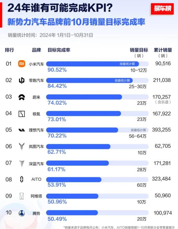 【CNMO 技术新闻:根据机构最新发布的造车新势力 10 月度销售目标达成率榜单,小米汽车作为造车新势力中的新星,第一年就高达一年。 90.25% 销售目标达到率居首位,远远超过国内其它新兴汽车品牌。这种表现意味着小米汽车有望在未来持续增长。