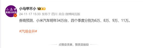 券商预测,未来一年小米汽车将冲击34万台。 网民直呼太传统