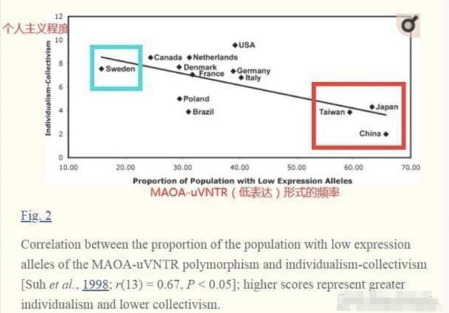 中国男人携带 MAOA 高达基因低表达变异的比例 77%,远高于白人。 30%。这种变异可以阻止体内去甲肾上腺素、多巴胺和血清素的分解,同时也有利于个人在高压环境下的冷静反应,因此被西方研究者称为 " 狂战士基因 "。