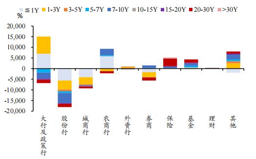 国内大银行和政策银行的主要净买入 1Y 内短债及 1-3Y 种类;农村商业银行主要净买入 1Y 内短债及 7-10Y 长期债务;券商主要净买入 7-10Y 种类,并净卖出 1Y 内短债及 1-3Y 与 20-30Y 类型;保险大幅增加仓位 20-30Y 类型;主要购买其他类机构(以海外机构为主) 1-3Y 品种及 7-10Y 种类。(见下图)