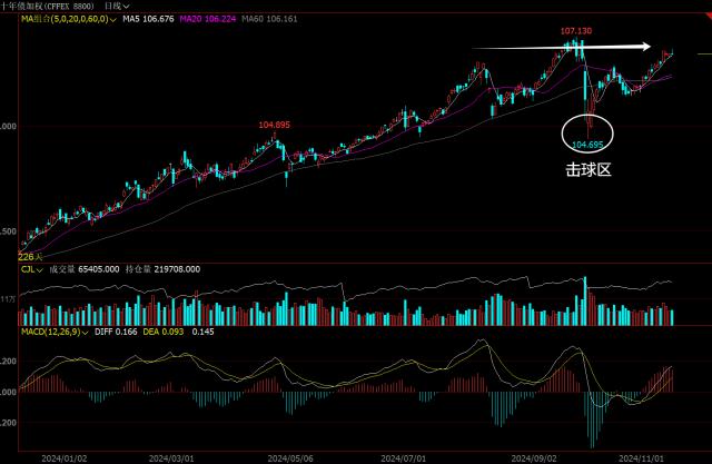 超过一个月,10 年度国债期货(加权)已从最低跌破 105 整数关口,触摸 104.695 点;站稳 106 整数关口,最高触点 106.820。