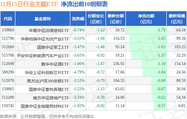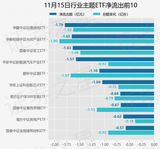 当天有 134 只行业主题 ETF 资金净流出,其中华夏中证动漫游戏净流出排名第一。 ETF(159869),份额下降 1.62 一亿份,净流出额为 1.79 亿元。
