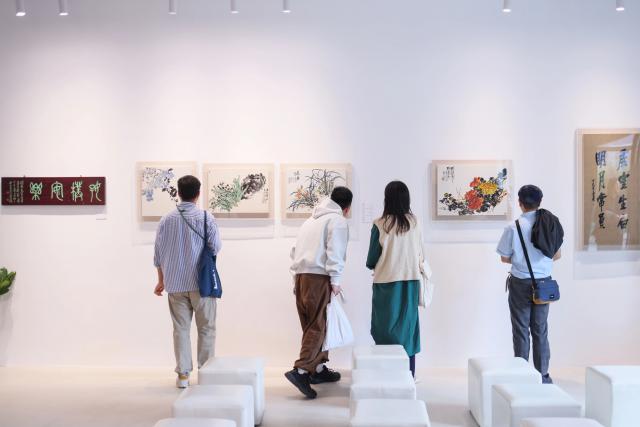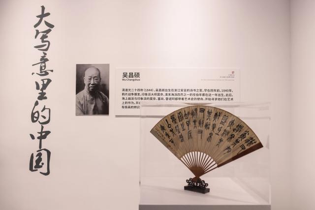 现场展出了吴昌硕创作的数十幅大写意作品,如花、兰石图、双兰、菊、松等,包括书法、绘画、篆刻等,通过书籍和绘画,生动地展现了自然物体的魅力和活力,展现了洒脱不羁的艺术氛围,展现了精湛的技艺和深厚的艺术底蕴。