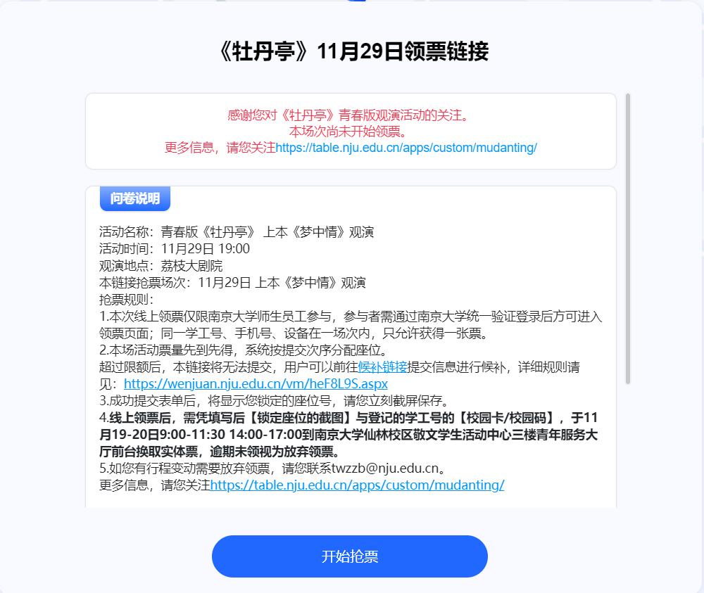 1、本次网上领票仅限南京大学师生参与,参与者进入领票页面前需经南京大学统一验证登录;一人一证只能领一张票(单次同设备、手机号、学工号不能重复领票)。