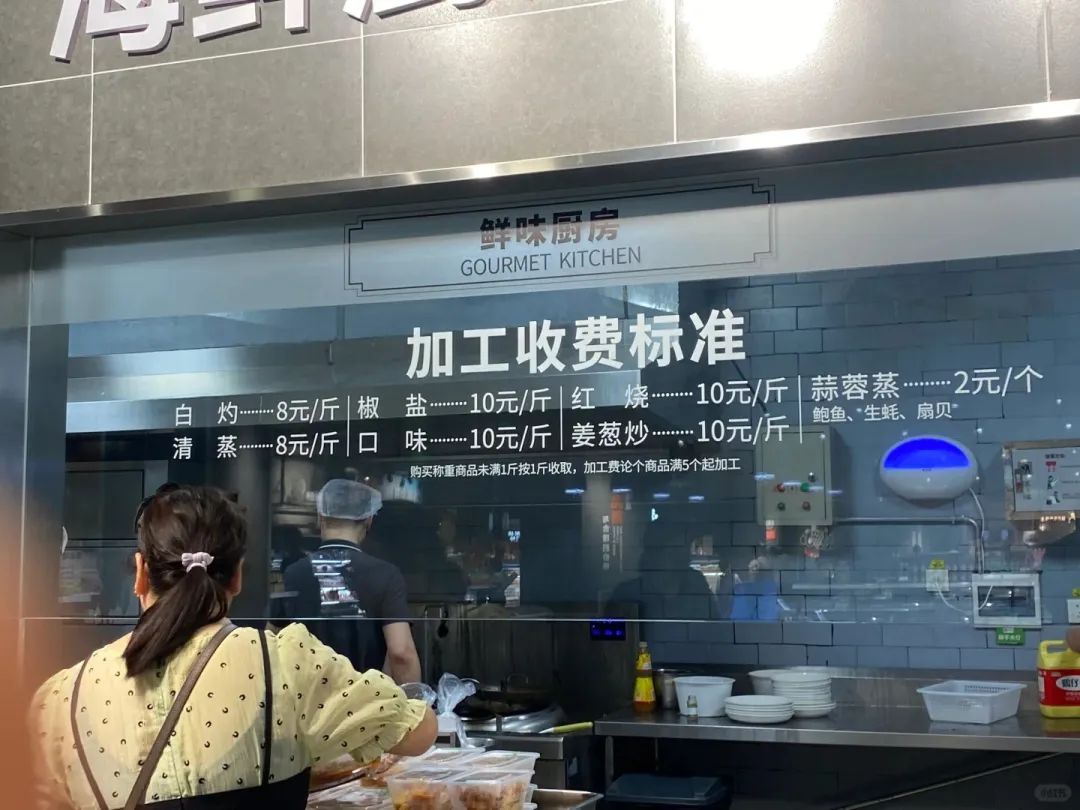 顾客在胖东来购买海鲜食材,可以直接在店内加工,收取一定的加工费。蒸、煮等简单加工一斤收费8元,炒、红烧复杂的收费10元一斤。