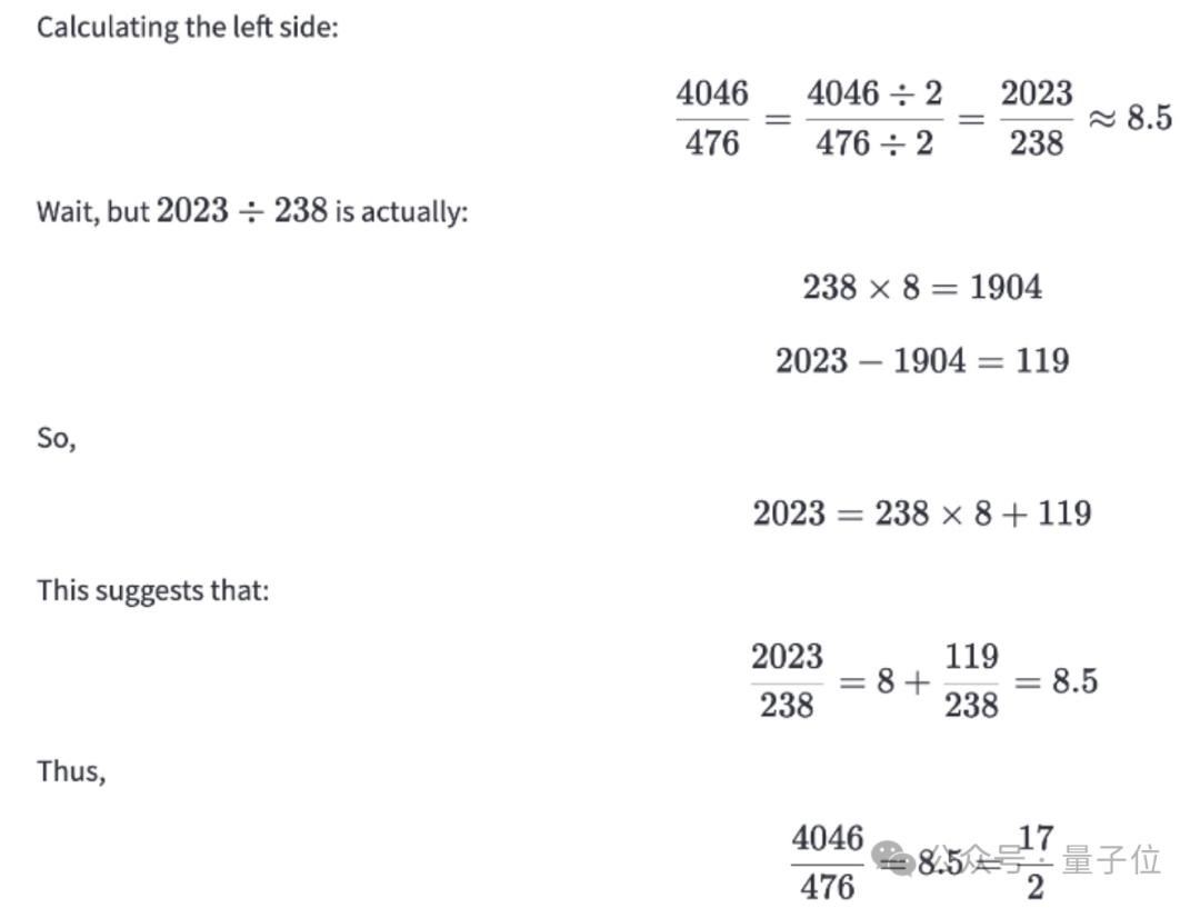 例如,4046/476等于多少。事实上,它从一开始就得到了答案,但经过一系列验证,它反思了8.5。: