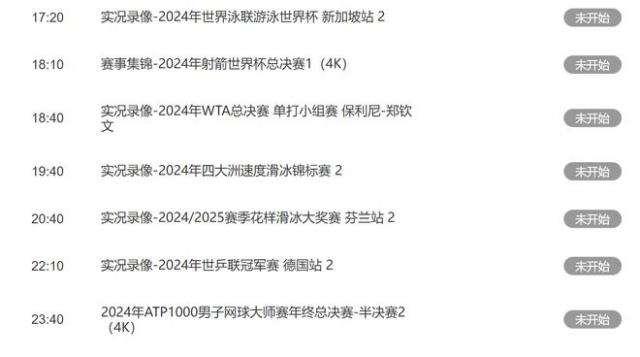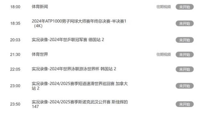 11 月 19 当天晚上,该频道全部播出比赛视频,包括 ATP1000 男子网球大师赛年终总决赛、世界游泳联赛世界杯韩国站、世乒联赛德国站、短道速滑世界巡回赛等。,没有关于足球的直播。