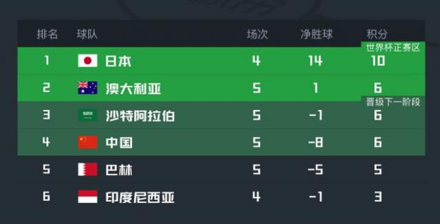除了国足 VS 除了日本,在同组的两场比赛中,印度尼西亚主场对阵沙特阿拉伯和巴林主场对阵澳大利亚,有可能同时打成平手,晋升形势将继续有利于国家足球队。一旦主场击败日本,国家足球队就会积累 9 分数,最多可升至小组第二。