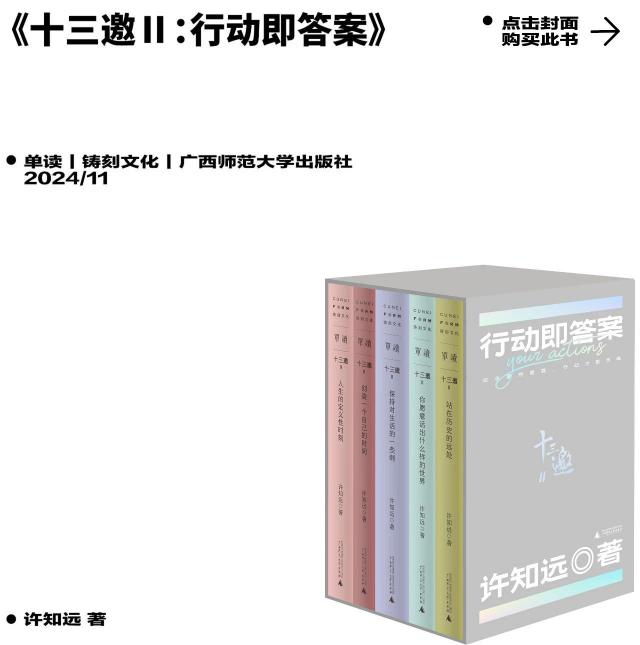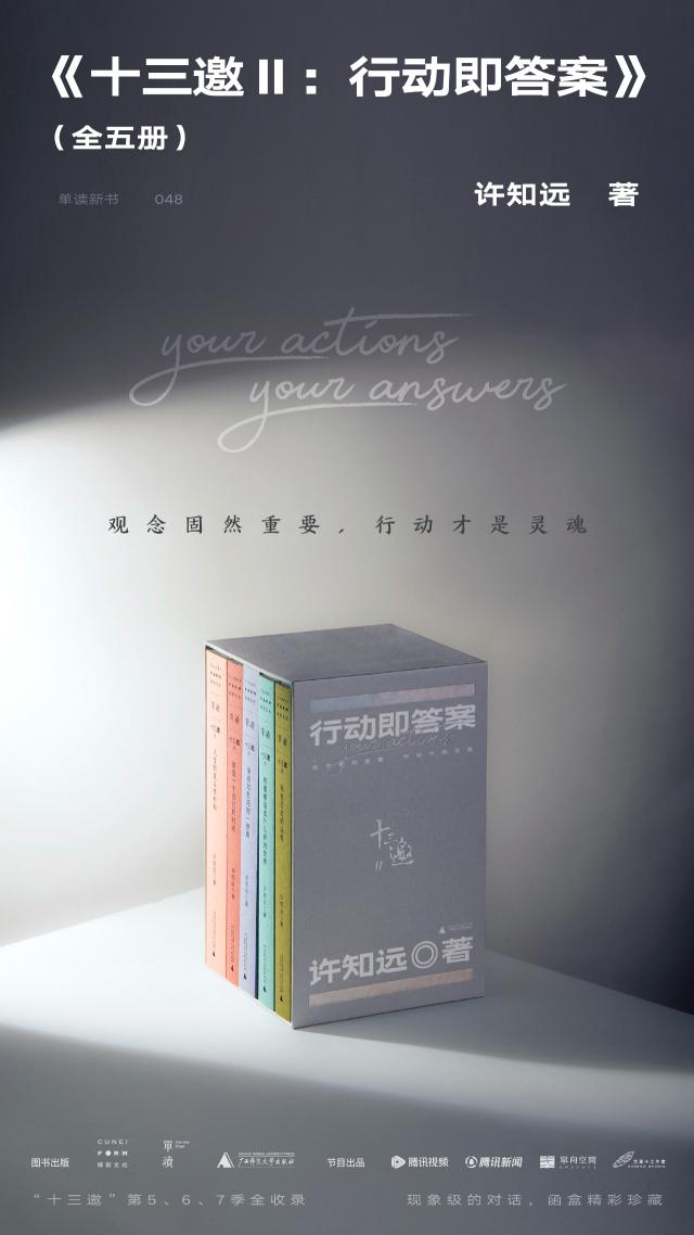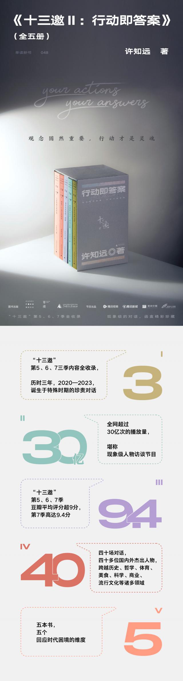 在通过图像不断探索的旅程中,《十三邀》也试图将具体而微不足道的语言和思想落到纸上,以文字的形式构建一个巨大的情感仓库。单读新书 048《十三邀 Ⅱ:行动就是答案”“十三邀”第一 5、6、7 季(2020 — 2023)共计 40 其中包含了几个角色的对话记录,整套五册。这些起源于特殊时期的宝贵对话,经过分类、整理、编辑,以更丰富的文字为读者呈现出更真实的对话质感。——