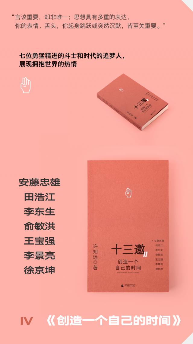 创造自己的时间其中,与许知远对话的是七个勇敢而勤奋的斗士和时代的追梦人。——安藤忠雄、田浩江、李东生、俞敏洪、王宝强、李景亮、徐京坤。他们都是真正的行动者。与使用天赋和知识相比,他们更多的是与世界和生活交谈,克服和战斗,赢得自己的时间,以坚强的意志、乐观积极的态度,甚至身体和本能。
