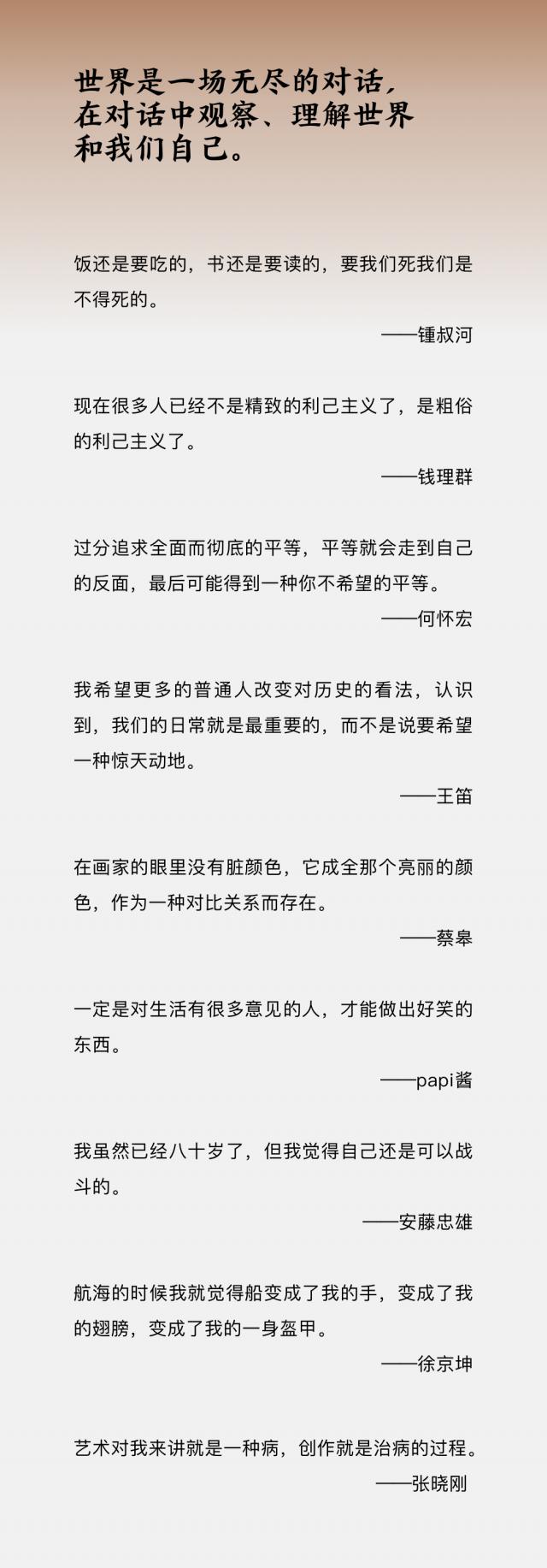 你们愿意活出什么样的世界?更加关注当前世界的具体问题。历史学家王笛说,一般人也能平庸有为;心理学家彭凯平说,人的本性还是要行动的;政治学者刘擎描述他对年轻人的观察;“网红”罗翔打破段子手的形象,展现他自省、谨慎的一面…