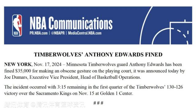 NBA “官方在处罚公告中写道:” 明尼苏达森林狼队后卫安东尼 - 爱德华兹因在比赛场上做出不当手势而被罚款 35000 美元,这是由执行副总裁、篮球运营主管乔 - 今天杜马斯宣布。这件事发生在 11 月 15 日森林狼队 130-126 在击败萨克拉门托国王队的比赛中,第一节还剩下。 3 分 15 几秒钟后,爱德华兹做出了不恰当的手势。"