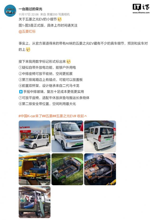 IT 世家 11 月 18 上周末,博主“骑手动感世界”“一辆路过的荣耀”等相继曝光了五菱旗下的全新车型 ——"电动 K-Car "五菱之光 EV 真实的车图。按照官方之前的概念,这辆车是“多功能工具车”,它不仅可以作为小型创业项目的理想选择,如移动咖啡店、移动酒吧、宠物护理站或移动花店,还可以成为城市短途货物运输的高效工具。