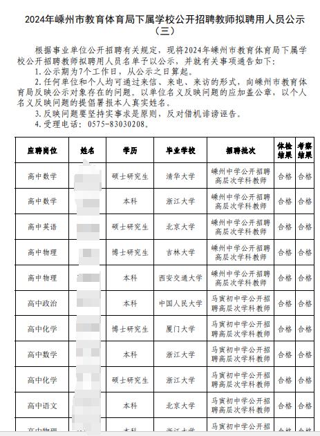 2024 年嵊州市教育体育局下属学校招聘教师名单公示。