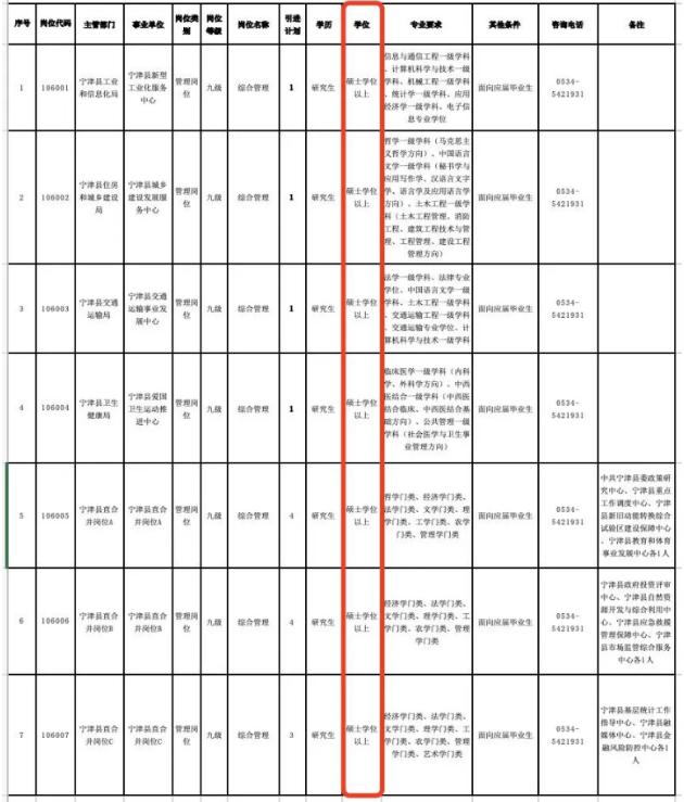 而且宁津县更夸张,看这个表格,还有本科学历的位置吗?研究生是最低要求。