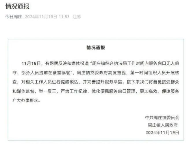 十一月十八日,有网友反映并媒体报道“周庄镇综合执法局工作时间内服务窗口无人值守,部分人员提前在食堂就餐”,周庄镇党委政府高度重视,第一时间组织人员进行审查,提醒相关人员进行谈话,完善提升服务措施。