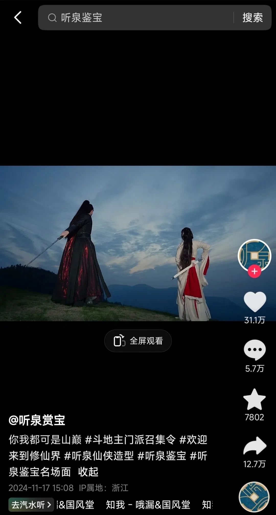 十一月十七日,一段以武侠为主题的短片在听泉赏宝的抖音账号上惊艳亮相,点赞数达到31.1万条,评论积累57000条。