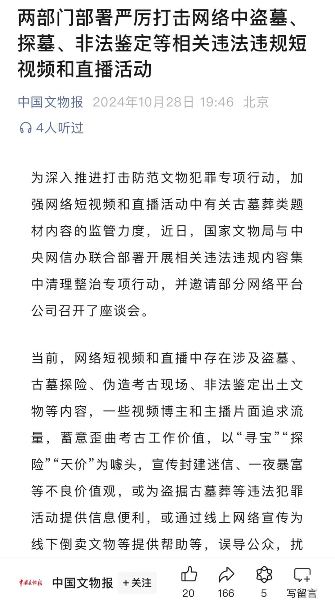 十月二十八日,国家文物突然发文称,将加强对网络短视频和直播活动相关古墓类主题内容的监督。