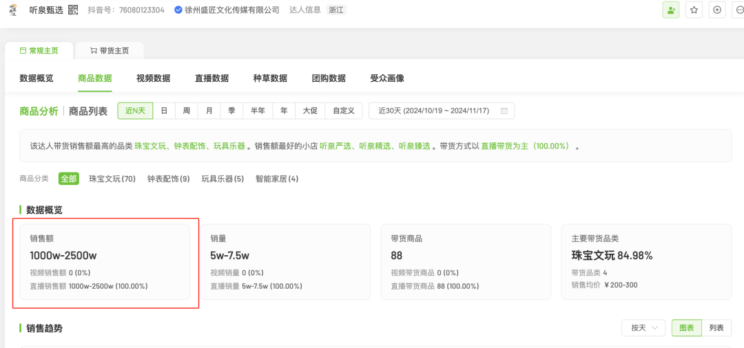 作为一位刚刚开始商业化的新头部主播,听泉在一个月内创造了2500万元的销售额,而且销售的商品都是直销。