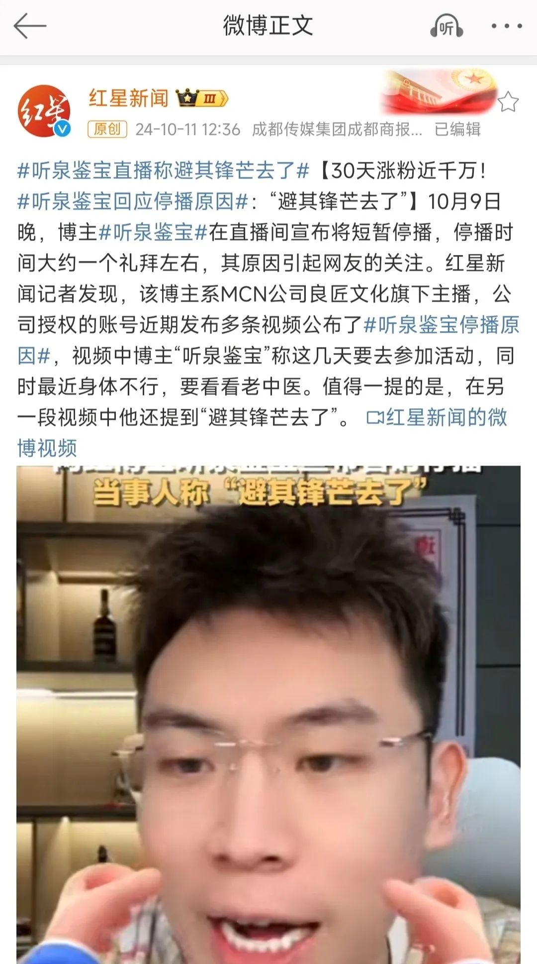 10月9日,听泉第一次停播。令人惊讶的是,这引起了外界的遐想。毕竟他说了一会儿“最近身体不好,要看老中医”,然后说“避开锋芒”。