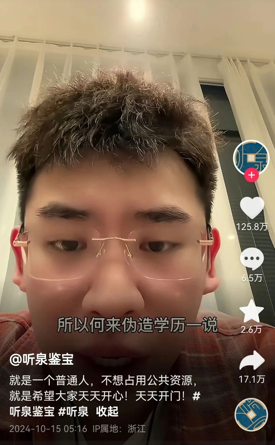 与此同时,大量的争议突然袭来。#听泉鉴宝被指塌房四大问题待解#词条一度冲上热搜,其中文凭问题最为关注。