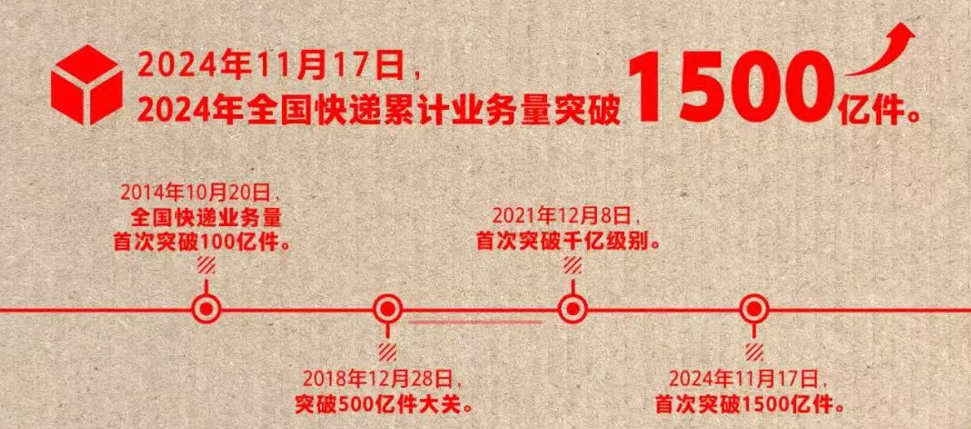 据国家邮政局公布的数据显示,2024年11月17日,我国快递业迎来了一个历史性的里程碑——年业务量首次突破1500亿件。
