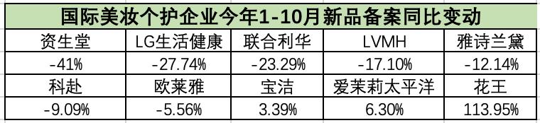 今年1月至10月,国际化妆品个人护理排名前十的集团在中国的新产品备案数量同比下降了14.6%,其中资生堂的新产品备案数量下降了41%。从品类来看,护肤、化妆、护肤三大品类都下降了23.47%、8.37%、13.88%。在熙熙攘攘的美容市场,只有宝洁、花王和爱茉莉太平洋的新产品备案在十大集团中保持增长。