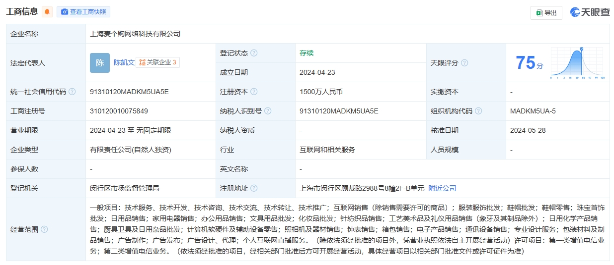 据天眼查,上海麦个购网络科技有限公司成立于2024年4月23日,是一家专注于互联网和相关服务的企业。经营范围包括网上销售、服装批发、化妆品批发、珠宝批发、日用品销售、家电销售、广告制作、个人互联网直播服务等。