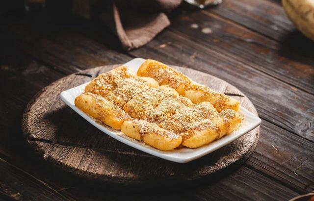 将糯米蒸熟捣碎成圆形。
