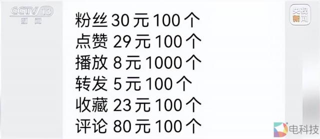 央视记者在一个电商平台上搜索“增加点击量”后,发现了大量相关商家。经过沟通,商家发了一份报价表,粉丝、喜欢、播放、分享、收藏、评论都是实实在在的,比如 8 可以买到元 1000 条播放量,100 个收藏只要 23 元等等。