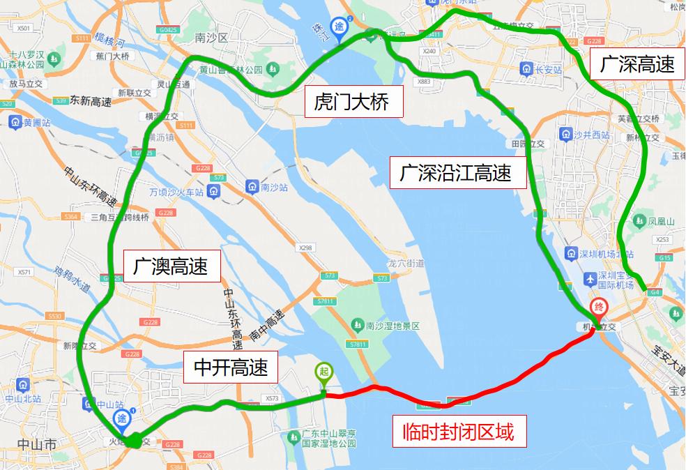 ▲深圳向中山方向:广深沿江高速或广深高速-南沙大桥-广澳高速-中开高速。