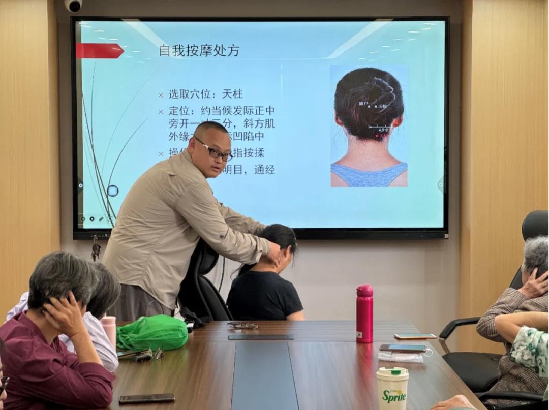 “随着年龄的增长,如果脊柱出现退行性变化等问题,可能会导致身体不正确、行动不便、肢体疼痛,甚至可能导致其他器官的残疾、瘫痪、头部、心脏等相关疾病。陈超洋整理总结了历代传统技术中脊柱技术和气功传承的导向技术,并逐一讲解,现场演示了几种常见的颈部不适的自我按摩处方,介绍了如何选择穴位、定位和操作包括天柱、夹脊和风池在内的各种穴位,方便居民回家后进行自我锻炼。