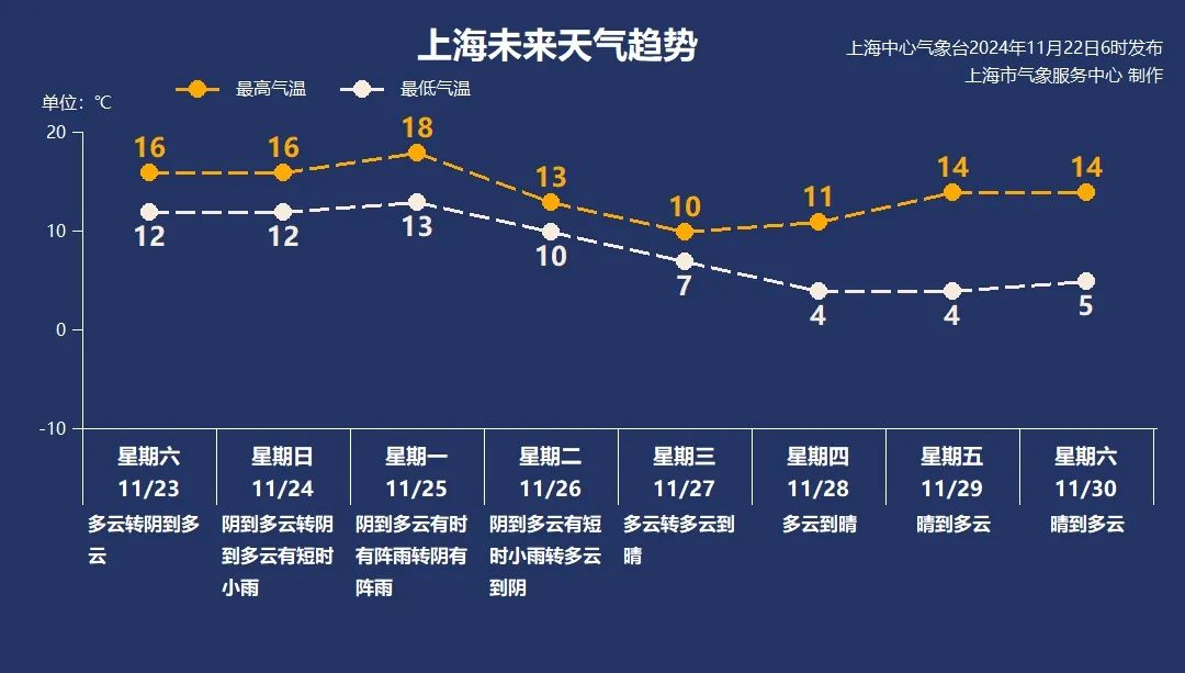 上海天气:周六云系增加,早晨多云天气为主,下午转阴至多云,气温为12。~16℃之间。从周日晚点到下周一,受短波槽东移影响,当地有一个降雨过程。下周二,由于冷空气的影响,申城将出现强风和冷却天气。未来中心城区最低气温将降至4℃周边,郊区将更低,冬季步伐将更接近申城。