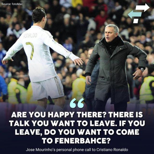 北京时间 11 月 22 据土耳其媒体报道,日 Fotomac 穆里尼奥致电报道 C 罗,问他是否有意加盟费内巴切。