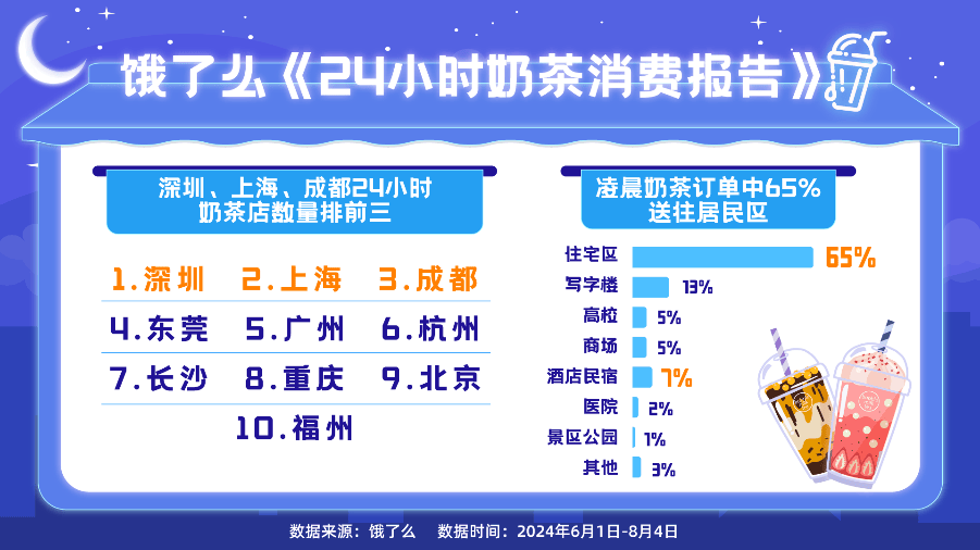 根据饿了么《24小时奶茶消费报告》的统计数据,仅今年6月初至8月初,平台24小时营业的奶茶业务数量同比增长140%。
